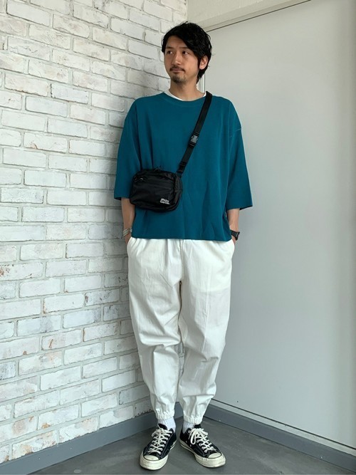 ゆるっとシルエットがカッコいいこちらのコットンニットTシャツのコーデは、幅広い年代で着こなせるアイテムです。ショルダーバッグが良いアクセントになっていますね。