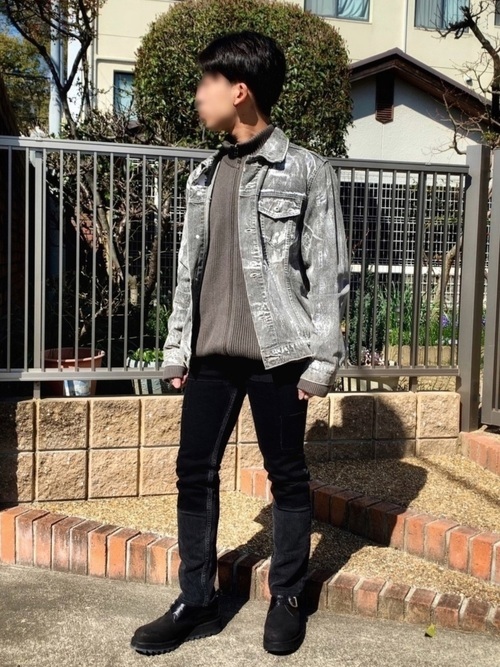 ニットキャップ・ベルト・バッグ・シューズを黒にすることで、統一感のあるスパイスが効いたコーデになっています。