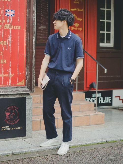 ポロシャツとパンツをネイビーのワントーンにすることで、いわゆる「オジサン感」を上手に回避している着こなしです。