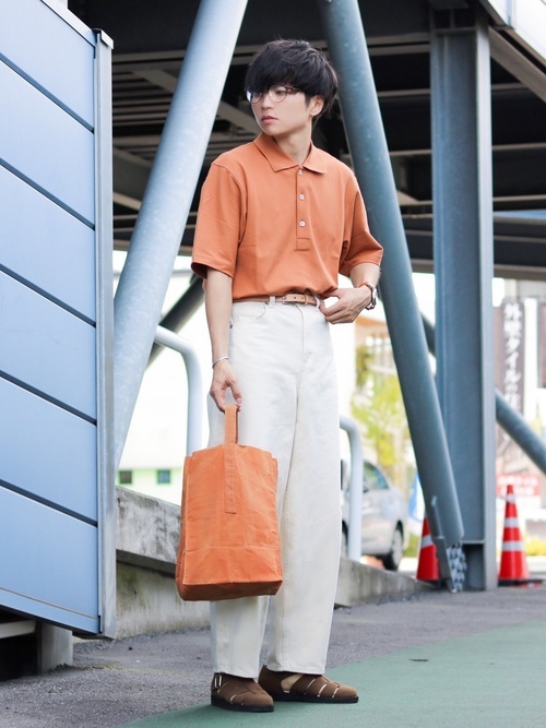 こちらはオレンジが映えるクラシカルなコーデですね。オレンジと白の上下で、一歩間違うとオジサンっぽくなるところを、ポロシャツのボタンを上までぴっちり留めたり、小物を入れたりすることでうまくバランスを取っています。