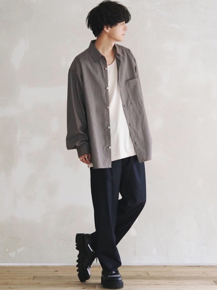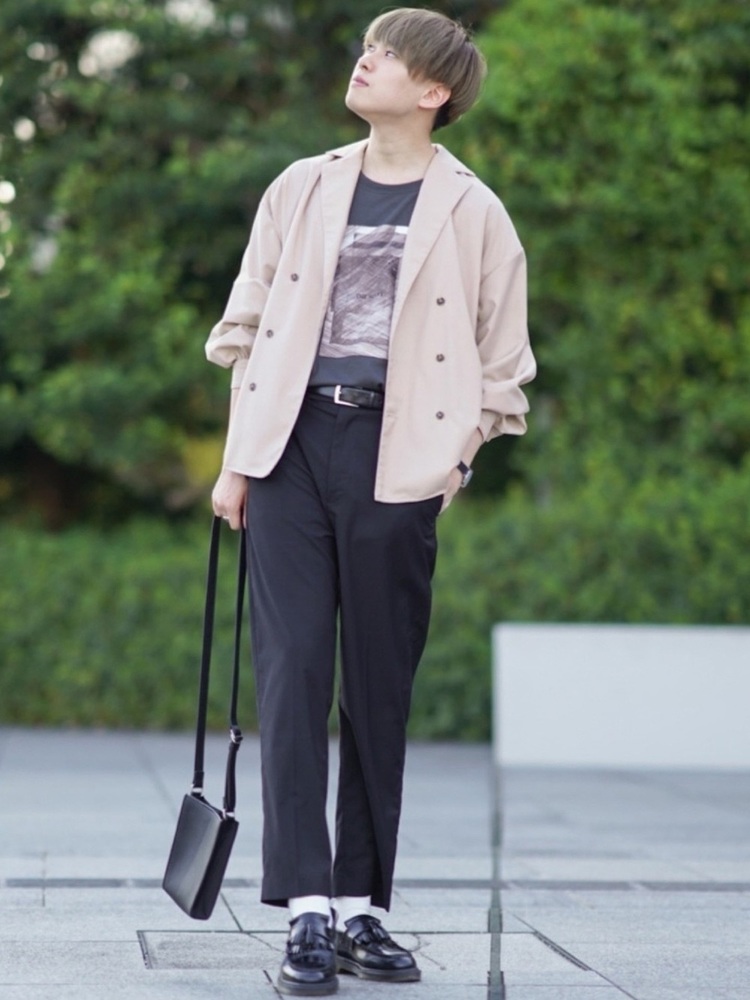 黒スラックスにプリントTシャツをイン、さらにベージュのシャツを羽織った重ね着コーデです。滑らかな素材でできたハイウエストスラックスが、カジュアルすぎないコーデに仕上げてくれます。スニーカーなどではなく、革靴できれいめな足元にするのがコーデをまとめるポイントです。