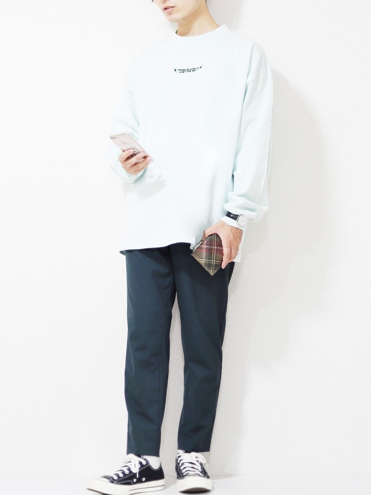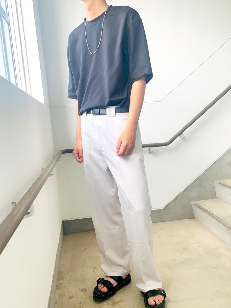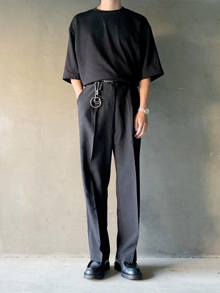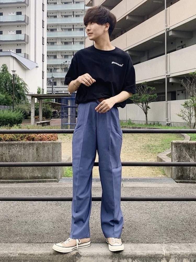 黒Tシャツとブルーカラーのスラックスで、メンズらしいコーデにしています。シャツのロゴのワンポイントがスポーティーな雰囲気を増してくれていますね。絶妙なブルーカラーのスラックスコーデは、黒やベージュなどのスタンダードな色味に飽きた方にもおすすめです。足元は、ベージュのスニーカーを選んで明るい印象にしましょう。