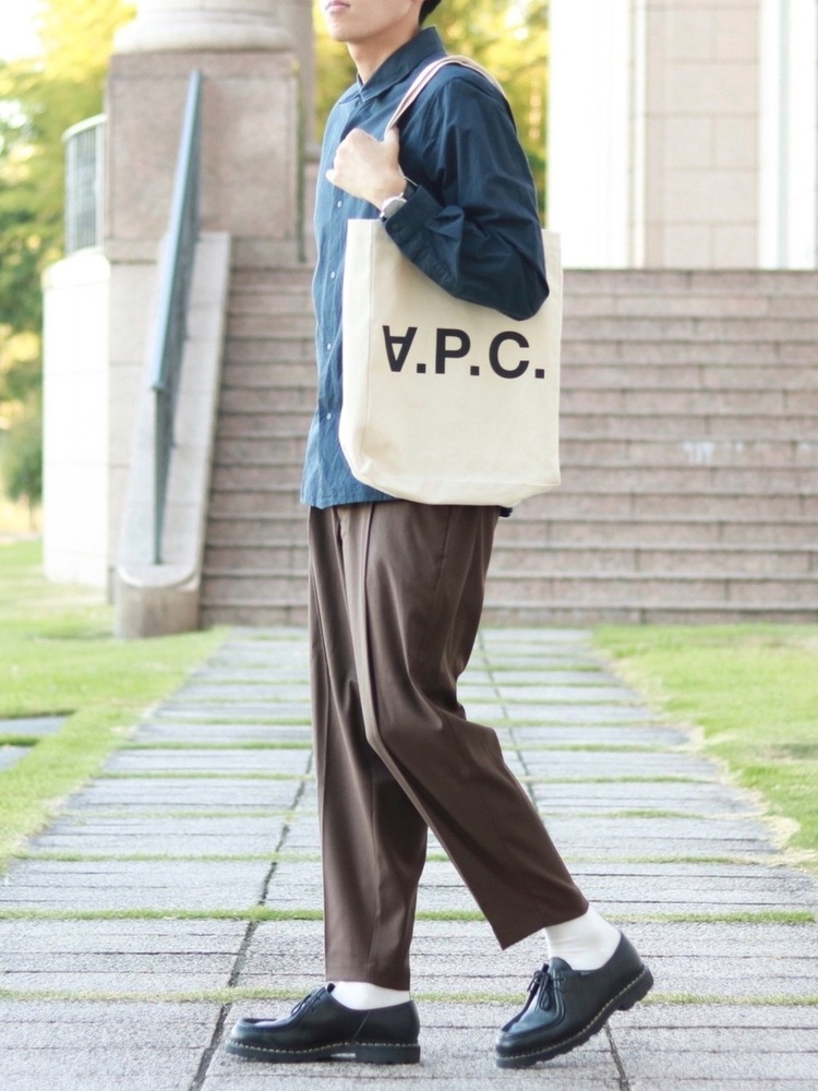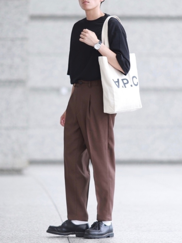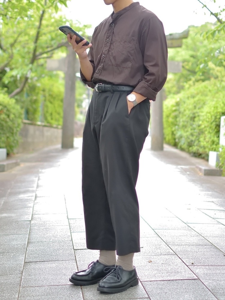 ネイビーのきれいめシャツとブラウンのスラックスで、トラッドな印象のコーデになっています。ブラウンカラーが入ることで、一気に秋っぽい季節感のあるコーデにすることができます。上質な素材のスラックスでワンランク上のスラックスコーデでありながらも、白ソックスでどこか可愛らしさがある万人受けコーデです。