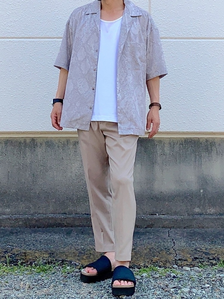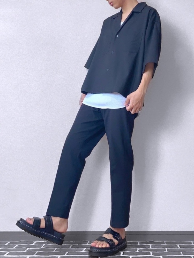 黒のスラックスとシャツで合わせたきれいめのブラックコーデです。白のインナーをチラ見せさせたり、足元はスニーカーや革靴ではなくサンダルを選び、程よく軽さを出しています。ハリのある生地のスラックスを選ぶことで、シンプルながらも高見えする大人コーデになります。