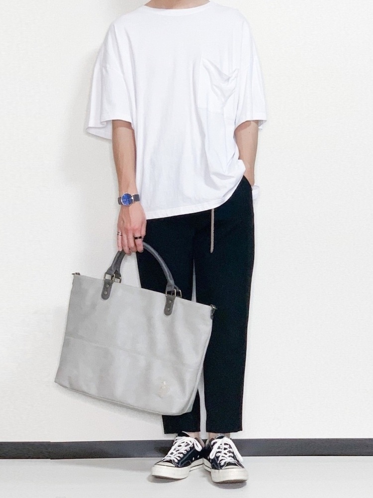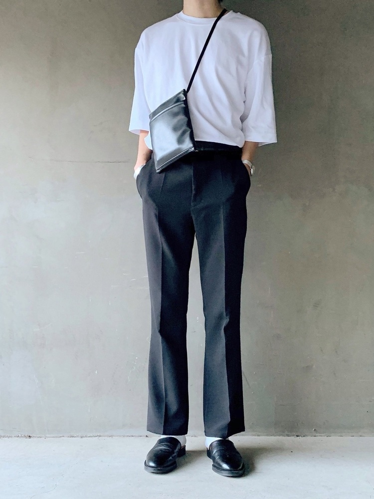 黒のスラックスに白コットンTシャツを合わせたモノトーンコーデです。センタープレスがしっかりと入り、尚且つ裾に向かって広がりのあるシルエットが、スタイルアップ効果抜群です。黒のバッグで上半身にアクセントを持ってくると、コーデに味が出てきてよりお洒落にまとまります。