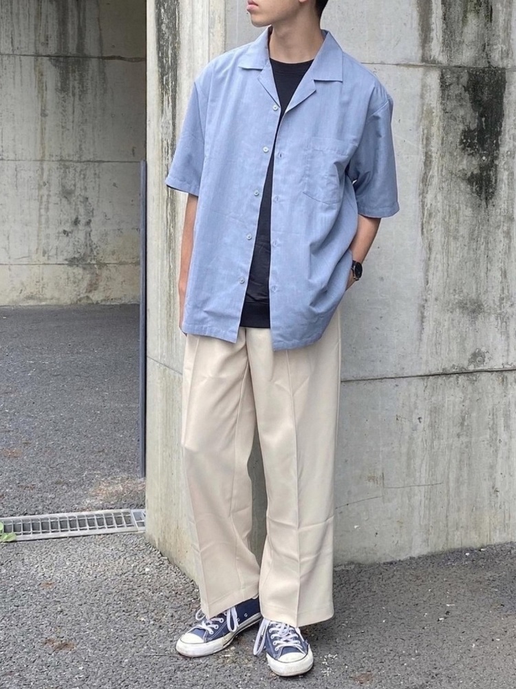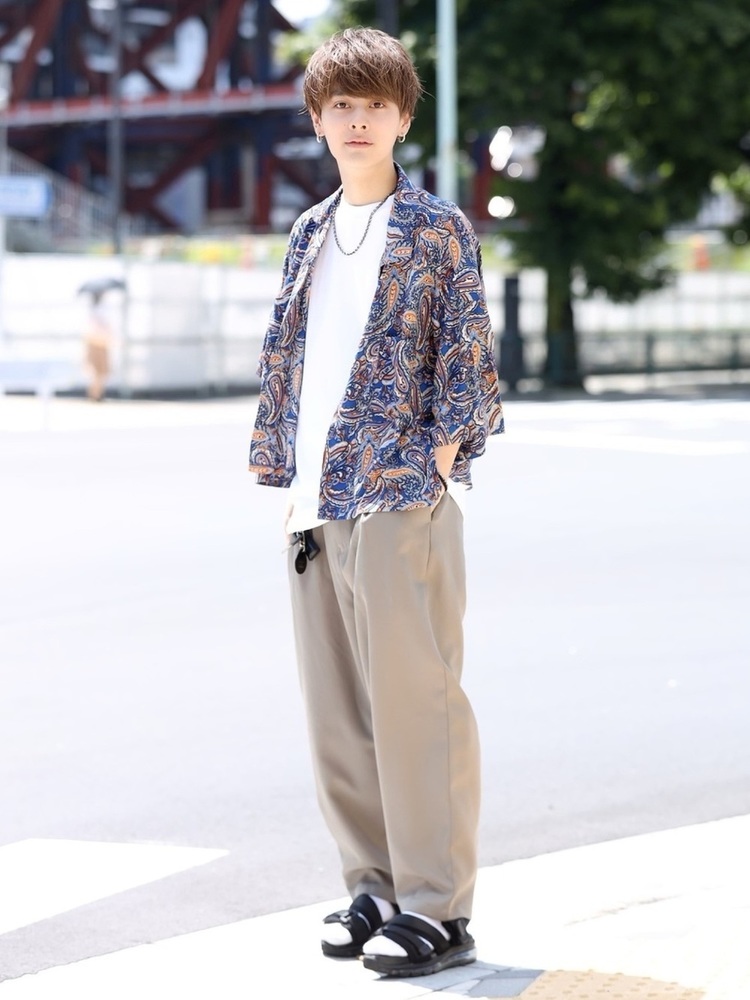 こちらも、ゆるっとした形のスラックスに、柄シャツを合わせたメンズコーデです。上下ともにゆったりと重さのあるシルエットで重厚感はありつつ、ブルーが映える柄シャツで涼しげな雰囲気にしています。ネックレスなどのアクセサリーで、顔まわりにアクセントをプラスするとさらに華やかなスタイルになります。