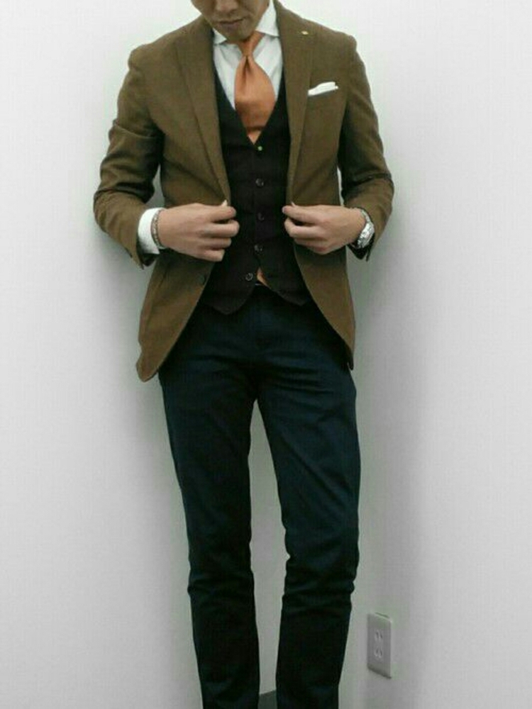 シンプルなデザインのスラックスに、ブラウンのテーラードジャケットを合わせた深みのある大人のメンズコーデです。カチッとはしていながらも、どこか遊び心のあるようなおしゃれなテイストに仕上がっています。ジャケットの下にベストをしのばせ、ダンディーな雰囲気を醸し出しています。ネクタイの色も明るめにし、周りからも親しみやすい雰囲気ですね。