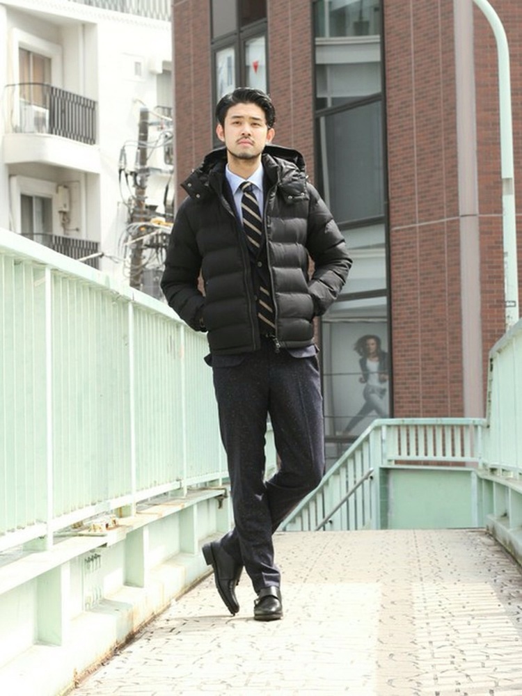 スラックスとジャケットを着た上から、さらにダウンジャケットを合わせた冬にぴったりなコーデです。スラックスは、くるぶしが見えない長め丈にして、革靴と合わせるとビジネスシーンにもOKな綺麗な着こなしになります。ショート丈のダウンジャケットで、上半身にボリュームをもたせることで、バランスの良いシルエットになっていますね。