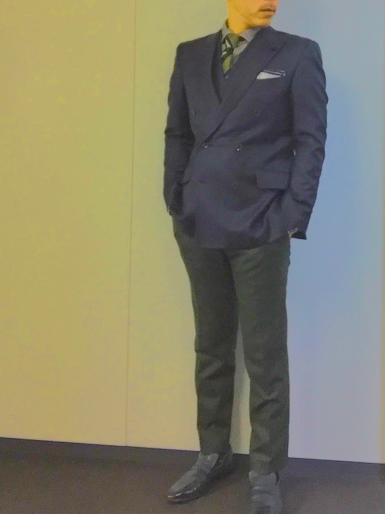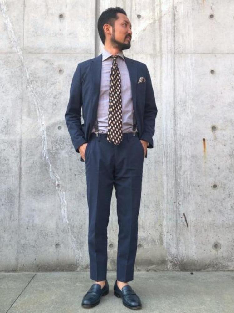 ネイビーのジャケットとスラックスを合わせたスタンダードなコーデです。シンプルではありますが、その分落ち着いた印象になり、好印象なスタイルになっています。革靴と合わせる際に、くるぶしが見える丈にすることで、堅くならずに程よい抜け感が出せますね。オフィスでもスーツをおしゃれに着こなしてオフィスコーデを楽しみたい方におすすめのスタイルです。