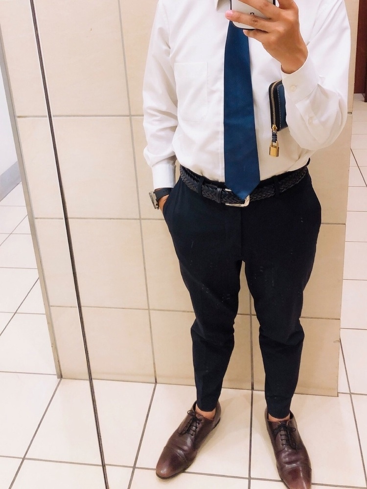どんな場面でも取り入れやすい万能なスラックスですが、やはりビジネスシーンやカジュアルな服装とで選ぶ形が変わってきます。カジュアルに着るなら、ダボっとしたスラックスにスニーカーも良いですが、ビジネスなどの場ではきちんと感のあるジャストサイズのスラックスがおすすめです。