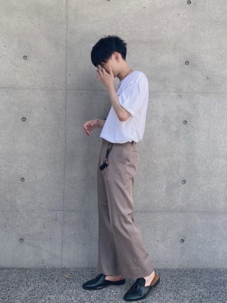 ベージュカラーのスラックスとシンプルな白シャツを合わせた、普段着にぴったりのラフコーデです。上下共に少しゆったりさせることで、休日にも最適なリラックス感のあるコーデになっています。裾広がりのスラックスと、かかとが見える靴は相性抜群で、足元に抜け感を出しています。