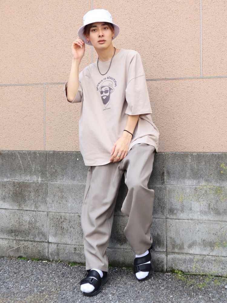 ベージュスラックスとベージュTシャツを合わせた、柔らかな色合いのメンズカジュアルコーデです。全体的にダボッとしたシルエットで、落ち感が魅力の生地のスラックスが今っぽいスタイルです。素足ではなく、あえて靴下とサンダルの組み合わせにすることで、足元まで周りと差がつくおしゃれコーデを完成させましょう。