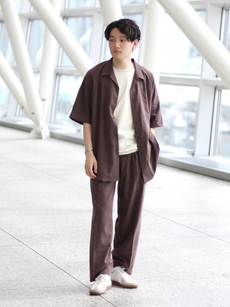 上下ともにブラウンカラーで合わせたセットアップのコーデです。シャツもスラックスも着心地に富んだ素材を使用していると、一日着ていても快適に過ごせますね。インナーやスニーカーもベージュ系のものにして、まろやかなカラー合わせにしましょう。親しみやすいような柔らかな印象のコーデで、友人からも好印象なこと間違いなしです。