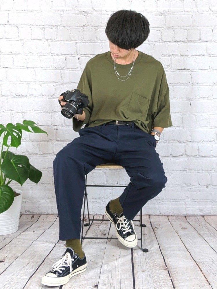 ネイビーのスラックスにカーキのTシャツを合わせたカジュアルコーデです。トップスとボトムスのサイズ感やシルエットのバランスが良い組み合わせですね。また、足元にもシャツと同色のカーキ色を入れることで、コーデ全体にまとまりが出ています。ボトムスと同じようなダークカラーの黒スニーカーを選んで、引き締まった仕上がりにするのがポイントです。
