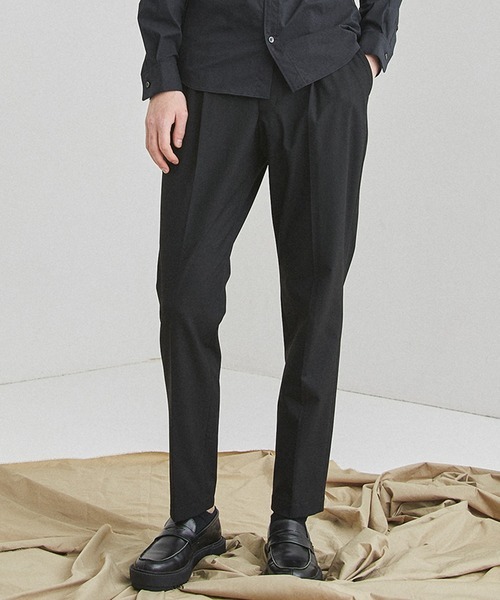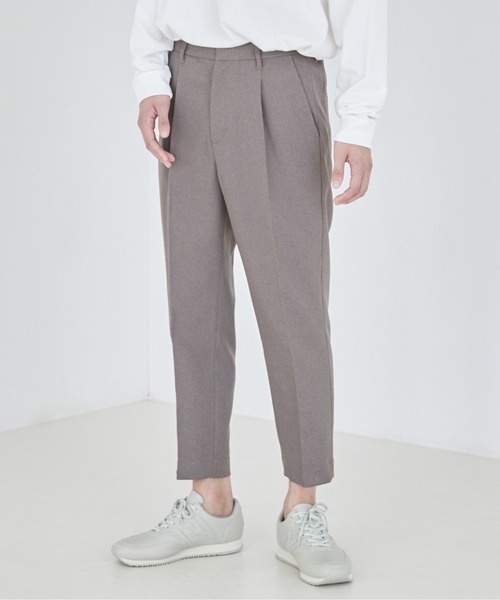 MONO-MARTのテーパードスラックスは、スーツ地を使用していて、上質な素材であり上品な印象で着用できるのが魅力です。ウエストのタックにより、カジュアルにもきれいめにも着こなせるシルエットが実現しています。