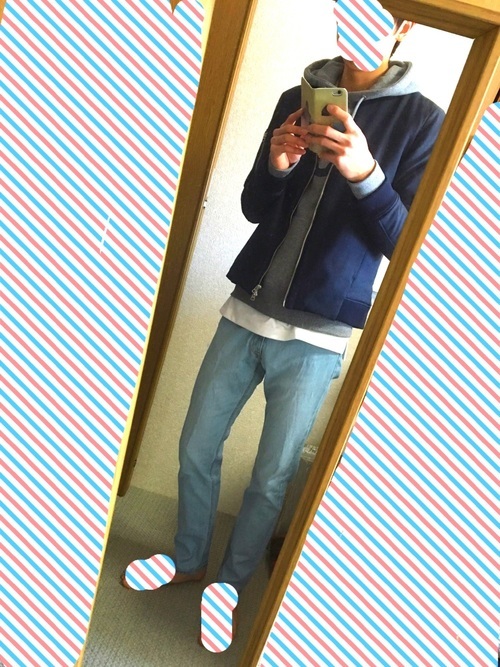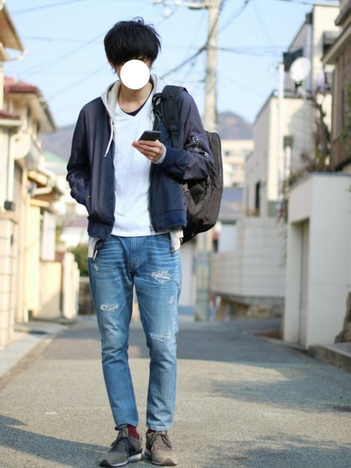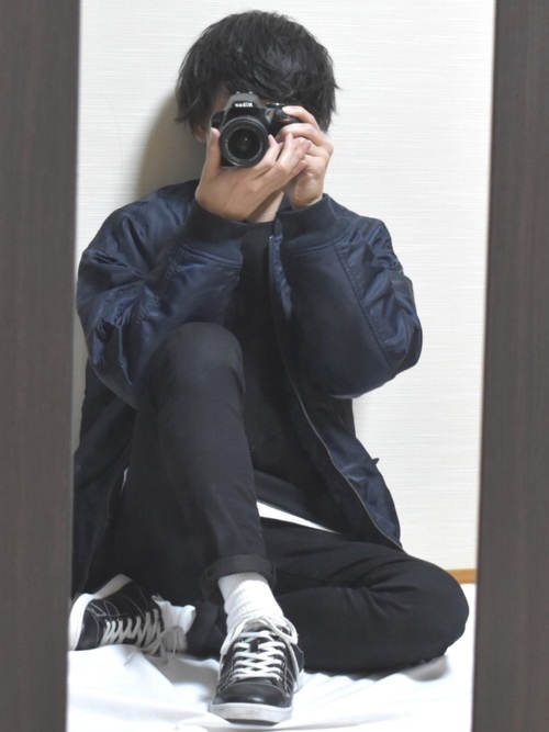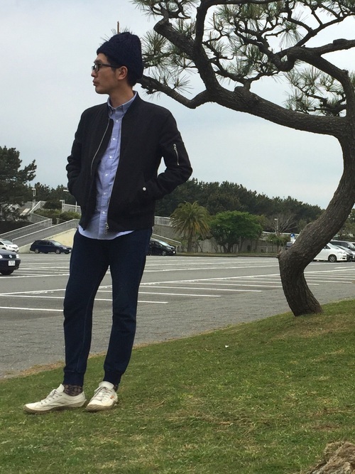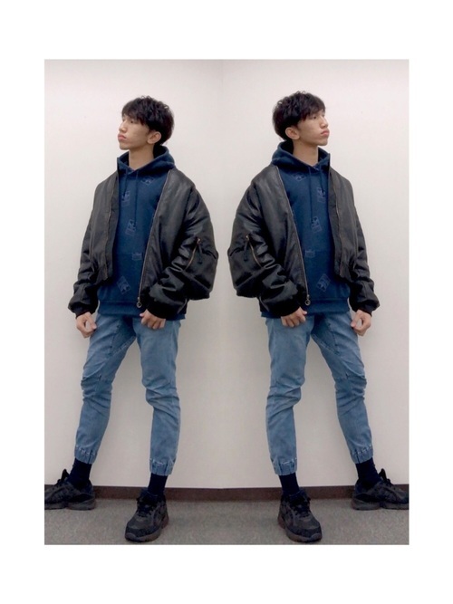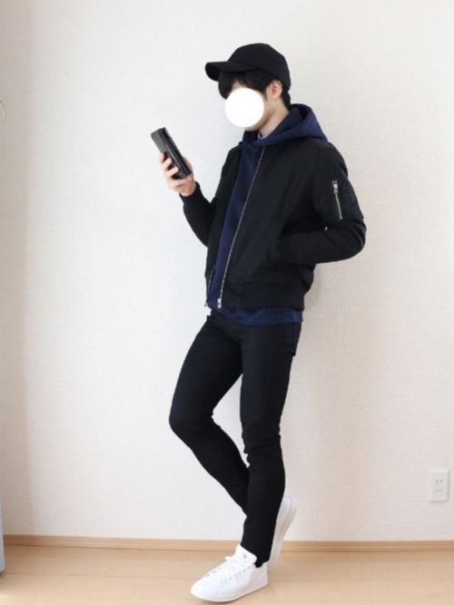 こちらはネイビーのMA-1にブルーのパーカーを組み合わせた着こなしになります。ネイビーのMA-1はスッキリしたアイテムなので、パーカーと組み合わせる際はワイドパンツではなく、スキニーのデニムにすることでスッキリさを際立たせることができます。
