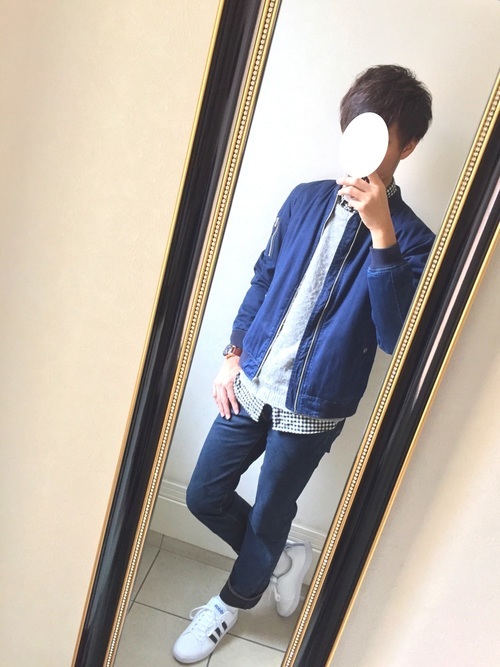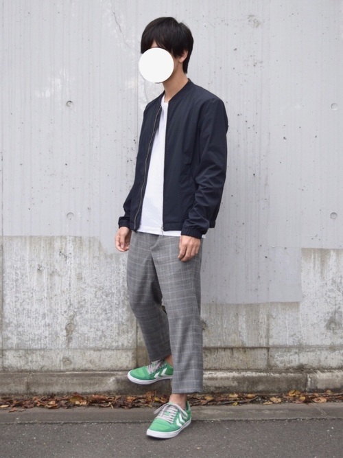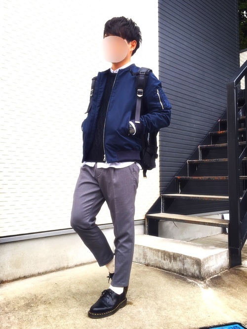 こちらはネイビーのMA-1とグレーのチェック柄パンツの着こなしです。ネイビーのMA-1はシンプルなアイテムなため、シンプルな柄のアイテムと組み合わせやすいのが特徴です。デニムと組み合わせるのがMA-1の人気のコーディネートですが、このような少し柄のあるパンツと合わせることで他の人と差をつけることができます。
