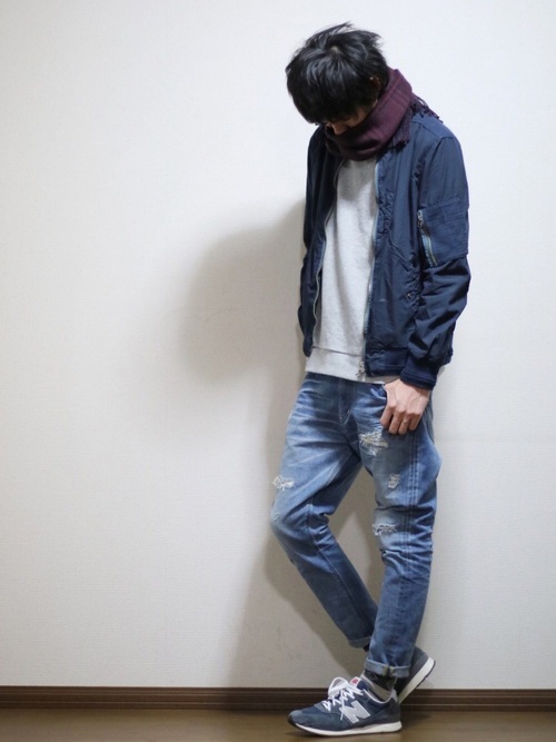 ネイビーのMA-1はデニムとの相性がとてもいいアイテムです。その中でもダメージデニムはラフな要素を加えることができるのでとてもおすすめのアイテムです。
