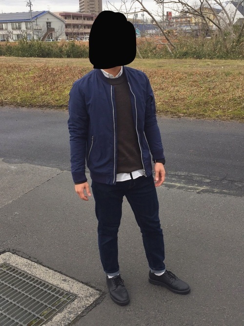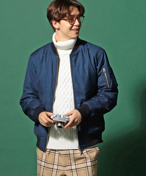 こちらはネイビーのMA-1とニットのコーディネートになります。ニットの色を暗い色にする場合は、ニットの中のシャツなどを明るい色にすると全体的に重い印象にならない着こなしができるのでおすすめです。