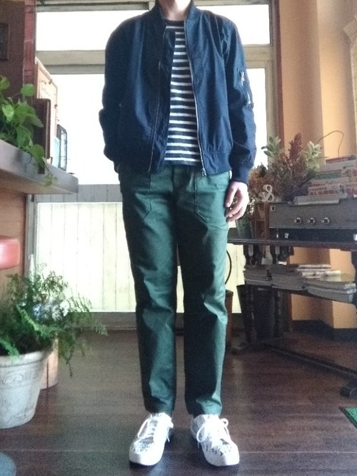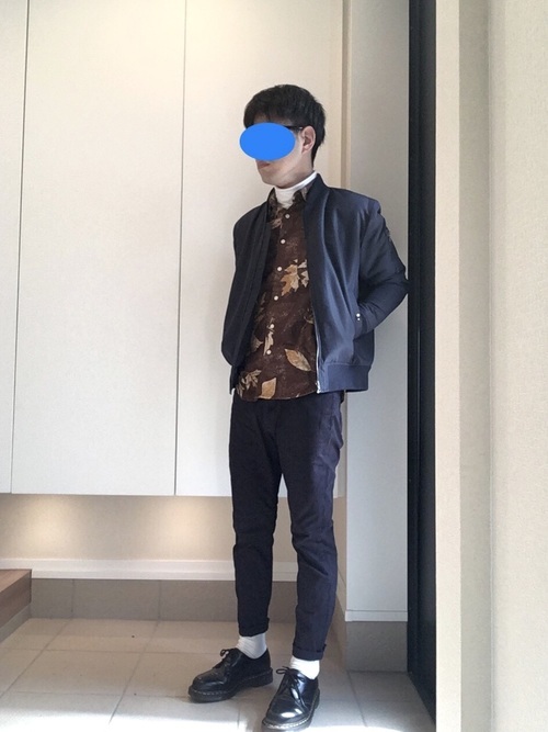 ネイビーのMA-1はシャツとの相性はとてもいいのですが、柄の目立つシャツと合わせるのはなかなか難しいアイテムです。組み合わせるシャツもシンプルな無地やストライプのほうがコーディネートしやすく、まとまりのある着こなしができます。