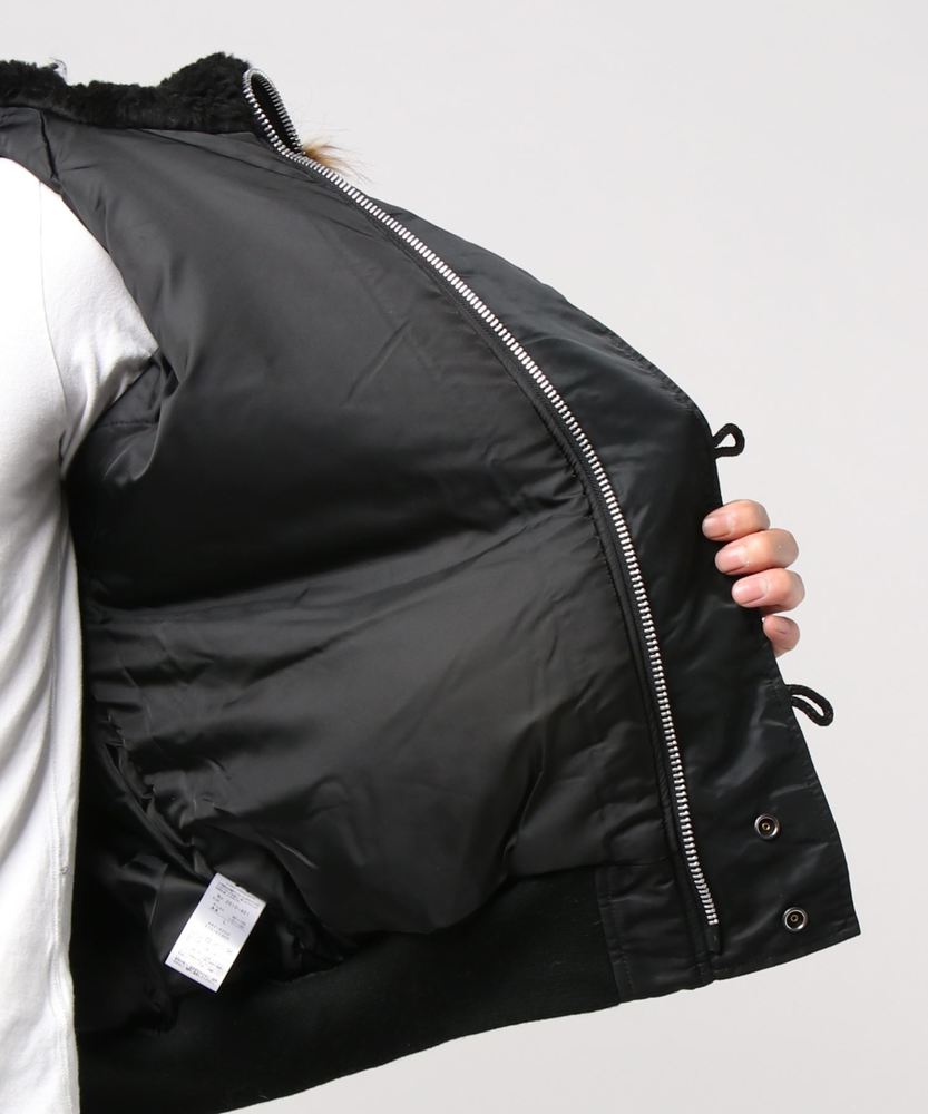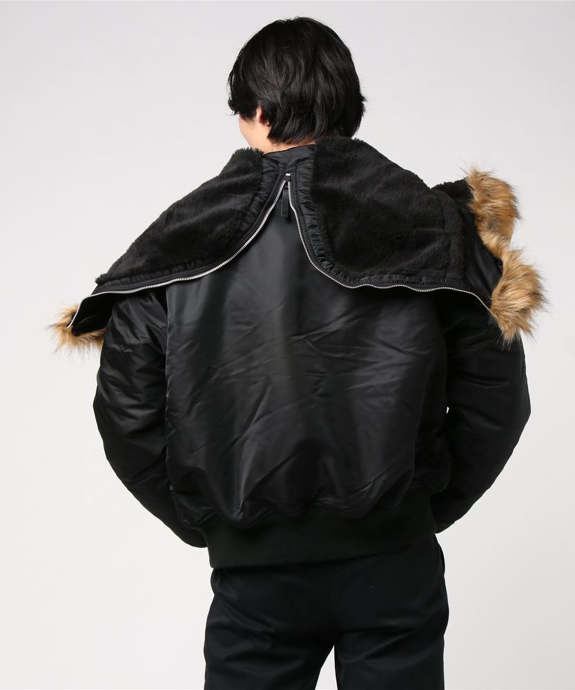 フードは、裏地がボア素材になっており、フード周りにコヨーテのファー付きでさらに温か。N-2Bは、フードがファスナーで左右に分かれるデザインのものが主流となっています。二分割になっているのは、もともと操縦席に座ったときにデッキに引っかからないようにするためでした。