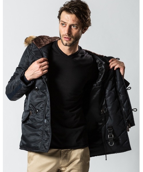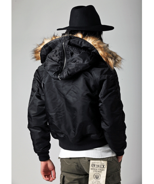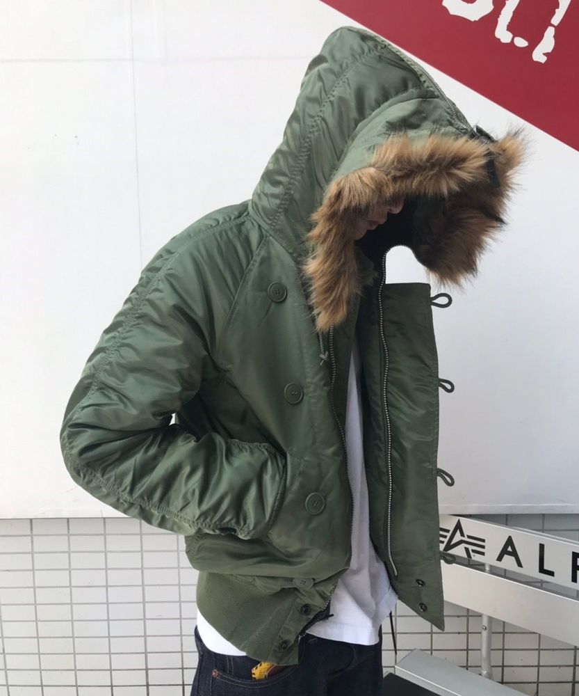 N-2Bは、保温性に優れていて「MA-1より温かい」という特徴を持っています。フロントは、ファスナーとボタンの二重構造で防寒対策は万全。ファスナーを上まで上げてフードをかぶれば、顔も温かく着こなせます。袖口はリブニットで冷たい風を遮断。生地が薄手いと風を通してしまいますが、厚手にできているので「保温性が高い」のも嬉しいポイントです。