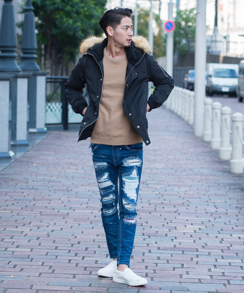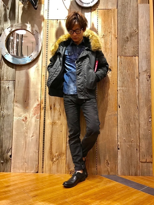 こちらは、ブラック系のN-2B×ブルーのシャツ×ブラックのスキニーパンツを合わせたコーデ。アウターは、別注のミリタリーブルゾンで、ボタンやファスナーがノーマルとは違ったデザインになっています。ゆったりとした着心地なので、すっきりとしたラインが特徴のスキニーパンツをチョイス。大人の魅力漂うミリタリーコーデです。
