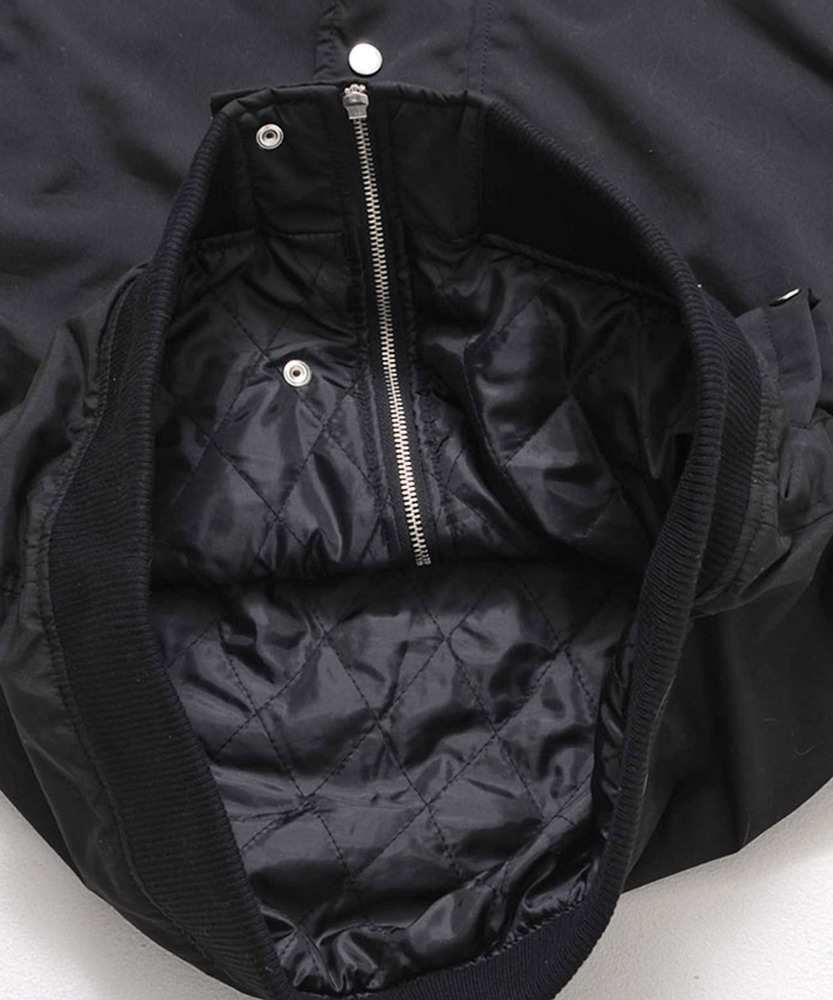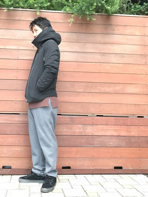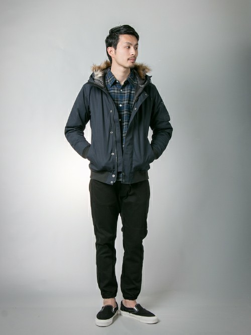 どうしても重ね着をする季節は、上半身がボリューミーになりがち。フロントファスナーを閉じて着こなすことで、裾のリブニット部分が強調されメリハリの付いた着こなしになりますよ。