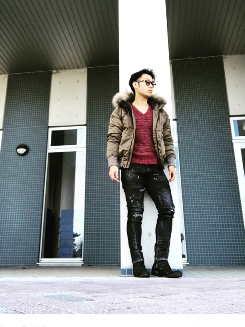 N-2Bのダウンブルゾン×レッドカラーニット×ブラックデニムを合わせたメンズコーデ。全体のコーデがカッコいいシルエットの着こなしです。ニットは、Vネックを選んでいるので、しっかりと抜け感が作られています。アウターのベージュカラーとニットの差し色でより華やかに。全体のバランスが整った程よいスタイルです。