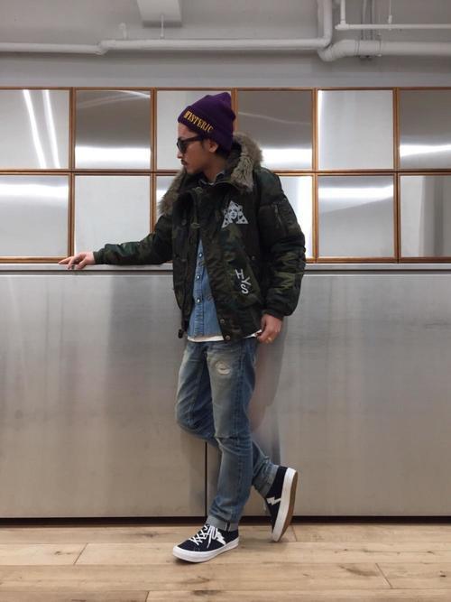 迷彩柄のN-2B×デニムシャツ×クラッシュストレートデニムを合わせて。上下同じブランドでまとめた着こなしです。デニムの裾はロールアップしてこなれ感を強調し、足元は、スニーカーを合わせてカジュアル感を演出しています。パープルのニット帽をさりげなくかぶれば、一気にお洒落なスタイルに。小物使いも鮮やかな大人メンズコーデです。