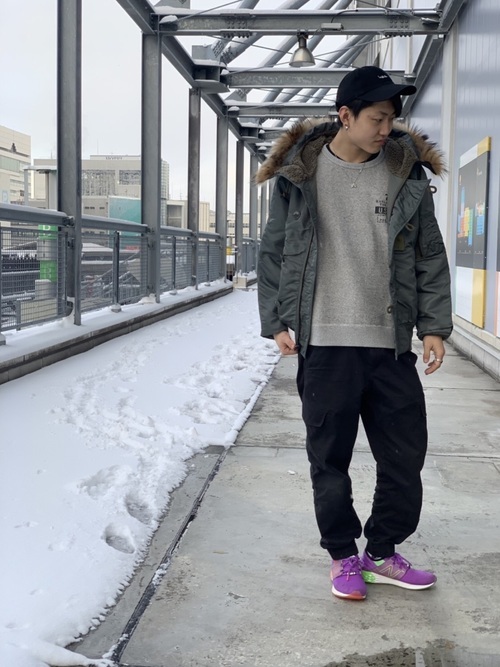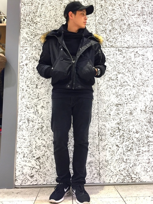 N-2B×タートルネックカットソー×パンツなどすべてブラックでまとめたオールブラックコーデ。全部がブラックでダークな印象ですが、アウターのファーやスニーカーのロゴが、ちょっとしたワンポイントになっています。シンプルな装いの中にも、シルエットにしっかりとメリハリが。キャップを取り入れると、さらにお洒落感がアップしますね。