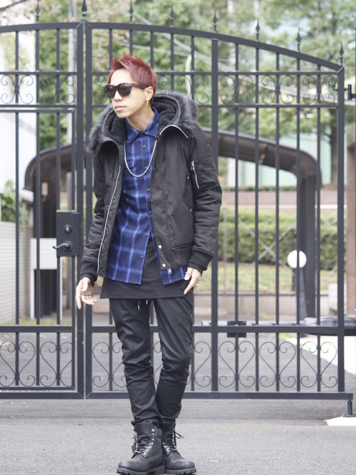N-2Bミリタリージャケット×カットソー×ジョガーパンツ×ブーツをすべてブラックでまとめたメンズコーデです。トップスにブルーのチェックシャツをレイヤードすることで、差し色がアクセントになった着こなしに。レザー生地のパンツを取り入れるなど、質感にもこだわることで、ニュアンス感の溢れる着こなしに仕上がっています。