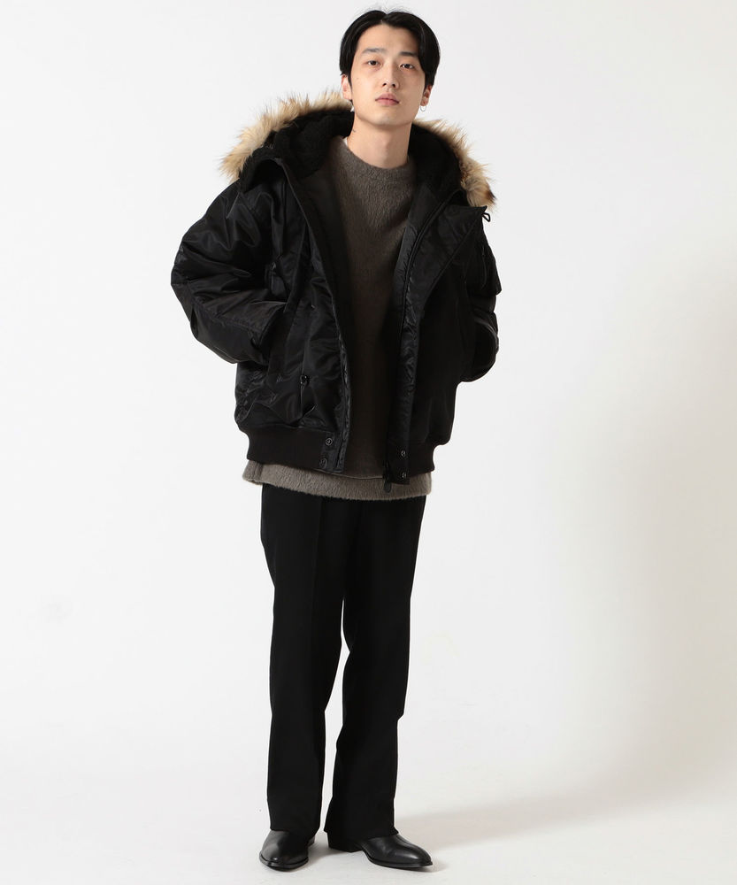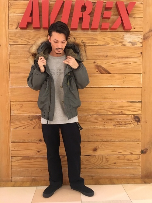 N-2Bのミリタリージャケット×ブラウンのカットソー×グレーのスラックスを合わせたコーデです。ジャケットのフードのボリューム感が、存在感をより引き立てています。カットソーは、裾をインせずにアウターからチラ見せ。グレーカラーのスラックスとの相性も抜群ですね。