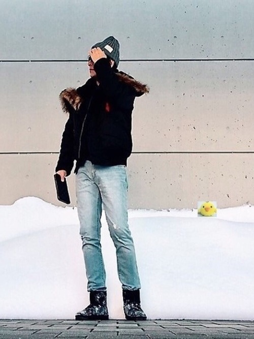 N-2Bのミリタリージャケット×ブラックカラーのカットソー×ライトブルーのデニムを合わせたメンズコーデです。上半身はブラックでまとめて、デニムにライトなカラーを持ってくるところもなかなか。パンツの裾は、ショートブーツにインしてキチンと感を演出しています。雪の季節にナチュラルに溶け込むお洒落スタイルです。