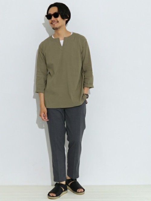 グレーのスラックスと、オリーブのベーシックなスキッパーシャツのコーデ。さりげなくインナーとレイヤードすることで軽やかな雰囲気をプラスし、足元をサンダルにしてこなれ感を演出しています。