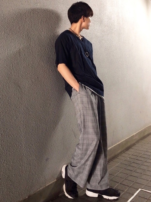 ワイドチェックパンツと合わせたラフなコーデです。スキッパーシャツとインナーをレイヤードして、コーデに少し違いを見せているおしゃれな着こなしですね。すとんと落ちているトップスなので、ワイドパンツと合わせても野暮ったさを感じません。