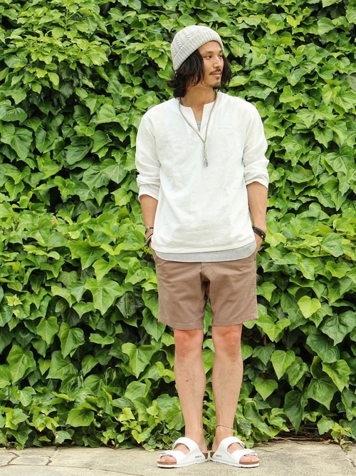 夏におすすめのハーフパンツとスキッパーシャツのラフコーデです。インナーとスキッパーシャツをレイヤードコーデすることで、淡白になりがちなコーデにさりげなく変化をつけています。きれいめなハーフパンツと合わせているので、コーデに締め色が入っていなくてもすっきりとした着こなしです。