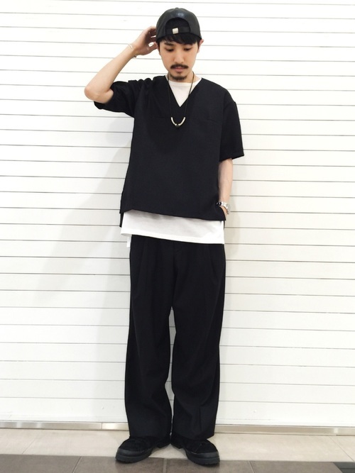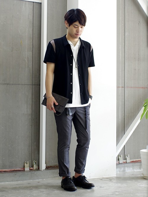白インナーとスキッパーシャツをレイヤードすることで、ブラックコーデにアクセントをつけています。トップスの丈も程よく、すとんと落ちているシルエットがきれいです。ブラックコーデの時は、素材感を変えたり白を少しだけ足したりすると、暗い印象ではなくモードな印象の着こなしにできます。