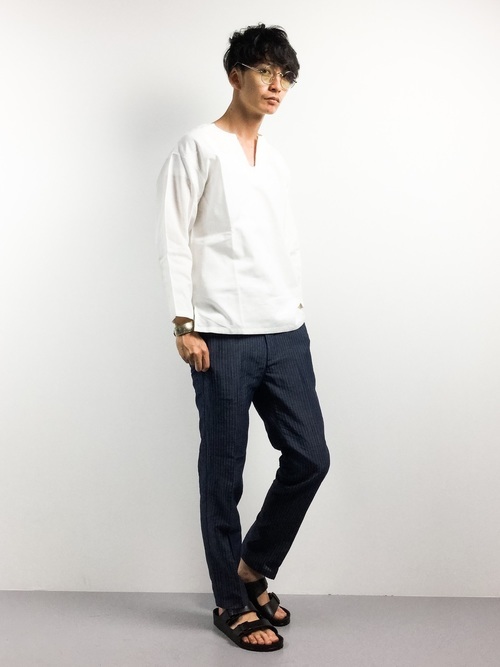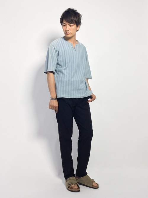 ストレッチパンツとストライプのスキッパーシャツを合わせた、リラックス感のあるコーデです。パンツが細身なので、トップスにボリュームがあってもすっきりとしています。足元も革靴ではなくサンダルにし、統一感をもたせた着こなしです。
