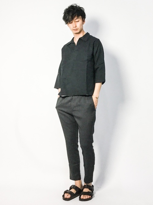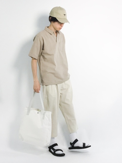 色と素材感の組み合わせが絶妙な同色系のコーデです。全体の色を少しずつ変えることで野暮ったさを感じさせません。襟が付いているスキッパーシャツにきちんと感があるのでだらしなく見えず、黒のサンダルが全体のコーデを引き締めつつこなれ感を演出しています。