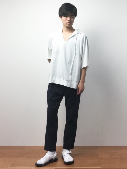 フードがついているスキッパーシャツとアンクルパンツのモノトーンコーデです。トップスのラフさが強いので、全体をモノトーンに統一することでコーデの雰囲気が引き締まっています。そしてサンダルに靴下を合わせ、こなれ感を演出した着こなしです。