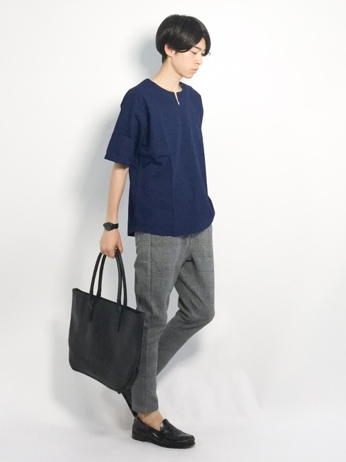 スキッパーシャツをインナーとして取り入れることで、堅苦しさを抑えつつもきちんと感は残した着こなしとなっています。スキパーシャツの抜け感が程よく、パンツもアンクル丈なのですっきりとした大人な着こなしです。