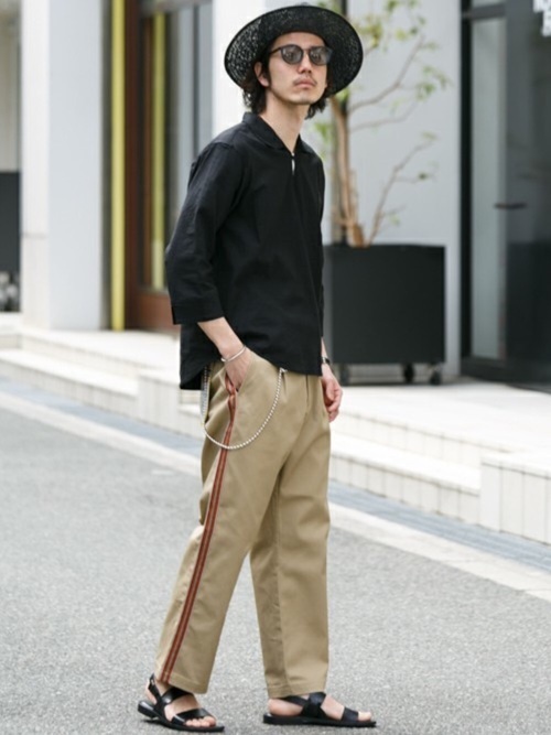 チノパンと襟付きスキッパーシャツを合わせた大人のモードなコーデです。襟付きのスキッパーシャツを合わせることで、パンツの個性を活かしつつもきれいめ要素をプラスしていることがポイントの着こなしです。そして足元のサンダルで抜け感を演出しています。