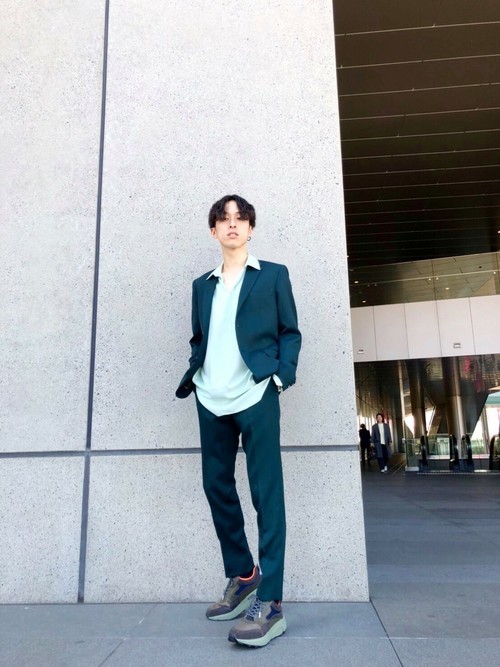セットアップとスキッパーシャツを合わせたスタイリッシュなコーデです。セットアップとシャツに似たカラーを選ぶことで、統一感があり大人の雰囲気をもつ着こなしとなります。そして足元をスニーカーにすることでこなれ感を演出し、堅苦しい印象を抑えていることがポイントです。