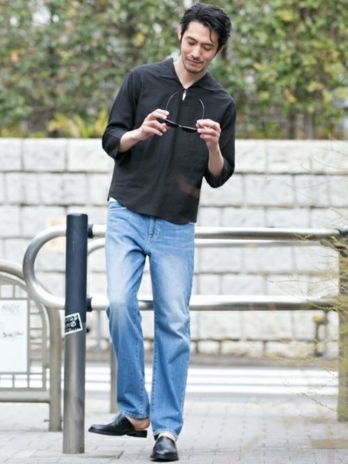 デニムパンツと、ボタンが1つ付いているタイプのスキッパーシャツを合わせたカジュアルコーデです。ボタンが1つ付いていることでラフさが抑えられています。真似してみたいシンプルな大人の着こなしです。
