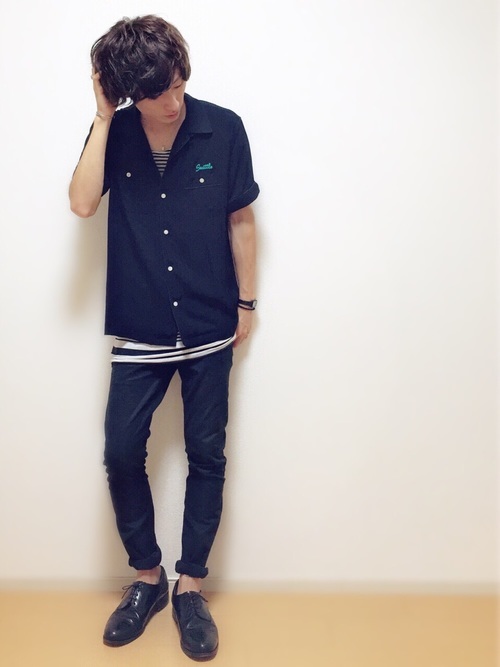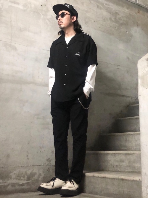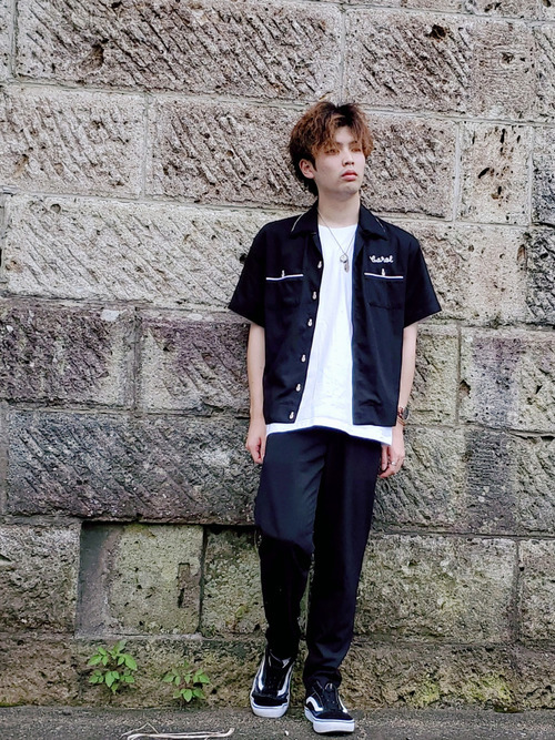 ボウリングシャツとパンツを黒でコーデしています。インナーには長袖の白シャツを合わせ、靴も白で合わせたロックな雰囲気漂う着こなし。サングラスやキャップなど、ブラックのアイテムを足してよりおしゃれでセンス良く仕上げています。暑い時期なら長袖ではなく半袖やタンクトップと合わせても良いでしょう。
