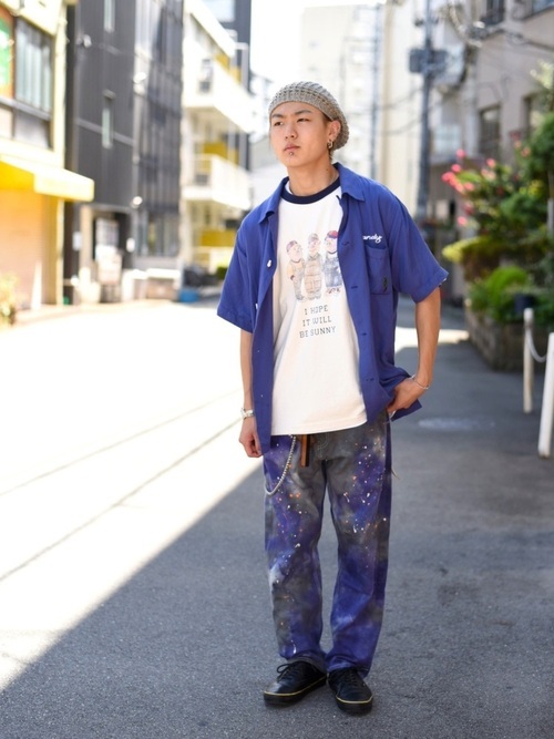 半袖のプリントTシャツの上にボウリングシャツを羽織るスタイルは真似しやすく、お洒落に見えるのでおすすめです。こちらはダメージデニムと同じブルーで合わせた着こなし。ブルーと白でコーデしつつも小物アイテムで遊ぶおしゃれ上級者のスタイルです。