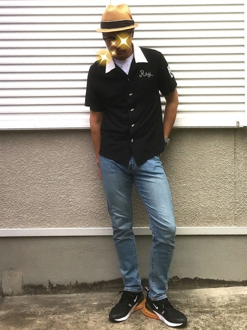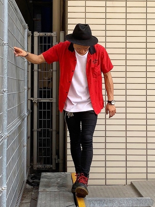ボウリングシャツにハットを合わせたルード系ファッションです。パンツは細身にすることで、50年代風の雰囲気を表現。シューレースを赤にし、ボウリングシャツのカラーと合わせるなど小技が効いた着こなしです。インナーには半袖ではなくタンクトップを合わせて涼し気にまとめています。