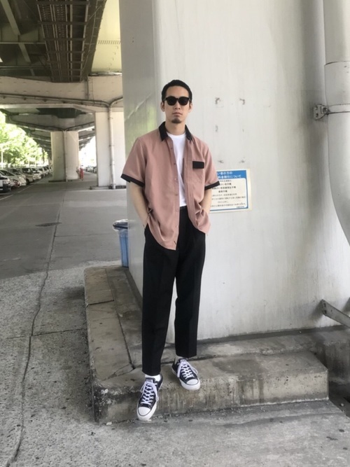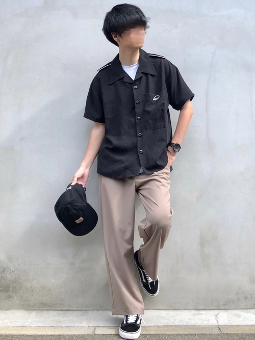 暖色カラーのボウリングシャツを着るのは勇気がいるという方もいるでしょう。しかし、くすんだピーチやベージュのようなカラーは日本人の肌馴染みがとても良い色味です。黒と合わせるとパンチの効いた印象になりますが、こちらの場合はインナーに白の半袖シャツを合わせることで中和しています。ボトムスはスラックスできれいめにまとめるのがおすすめです。