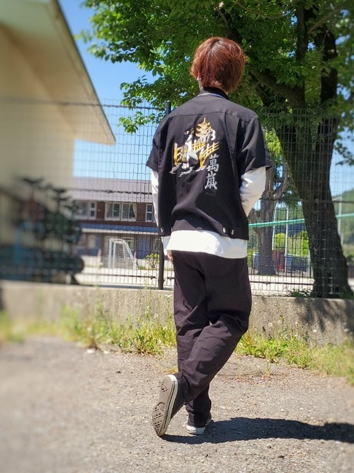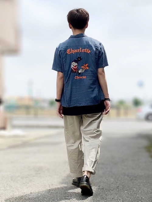 ボウリングシャツを選ぶなら背中の刺繍が大きく入ったデザインの物をセレクトするのが醍醐味です。こちらはボウリングシャツのトーンと合わせてパンツもくすみカラーをセレクト。インナーの半袖シャツや靴で黒をちりばめて引き締めています。肌寒い時期なら黒の長袖シャツと合わせても良いでしょう。
